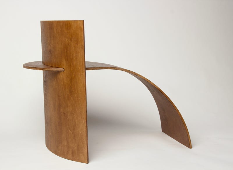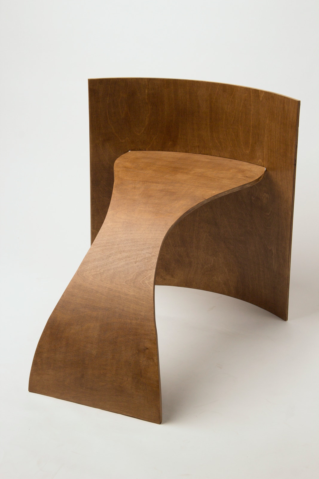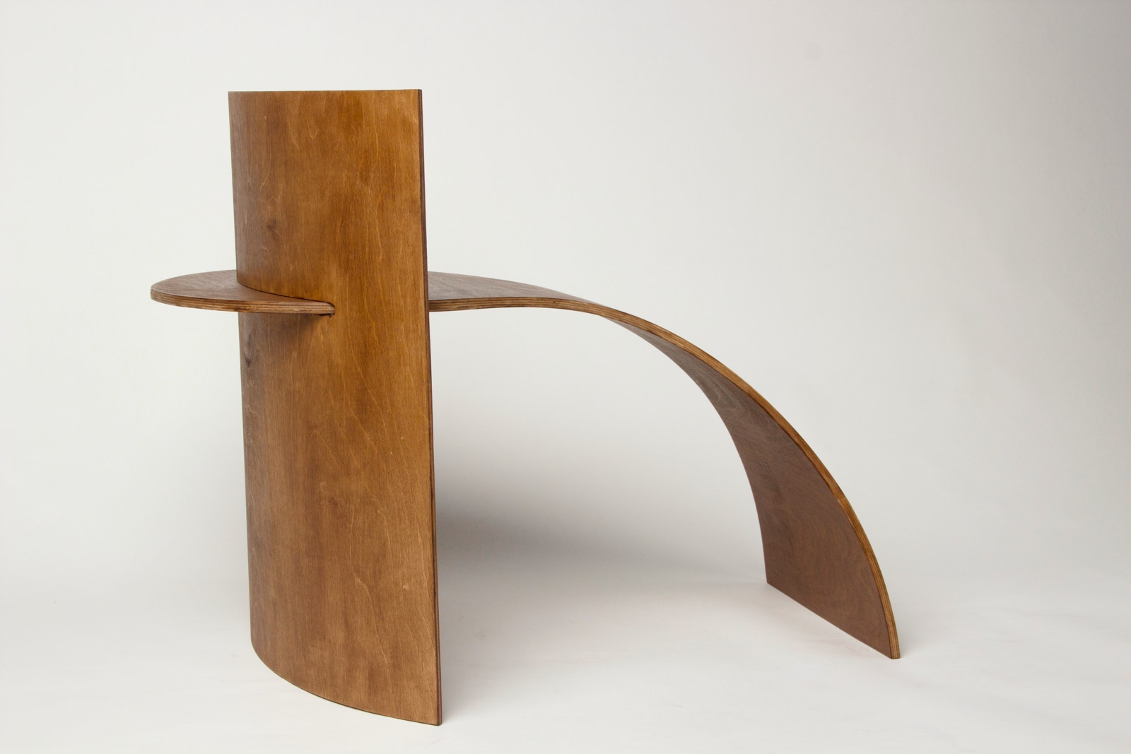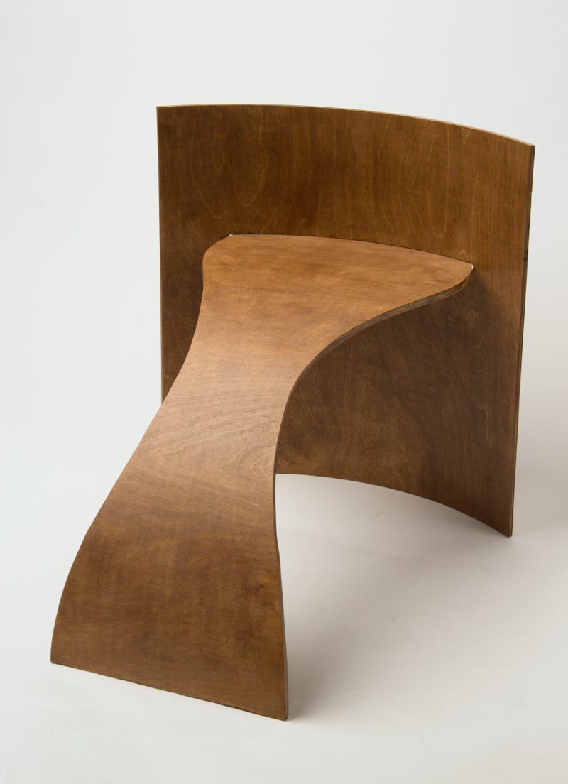 Door te experimenteren met de techniek van het buigen van hout door lamineren heb ik een kruk gemaakt. Het uitgangspunt van het ontwerp was een schuivende verbinding. De twee houten delen sluiten op elkaar aan en zijn onbruikbaar zonder elkaar. Er ontstaat een balans tussen de houten delen en in het ontwerp. Het krukje helt een beetje over zodat het recht wordt als je erop gaat zitten. De boog van de houten delen is gelijk zodat het gemakkelijk wordt om de kruk op te bergen of te vervoeren.