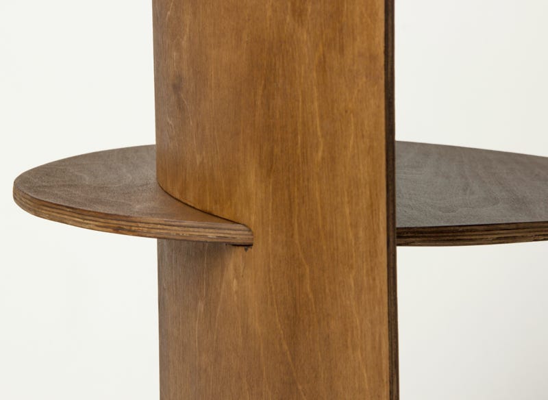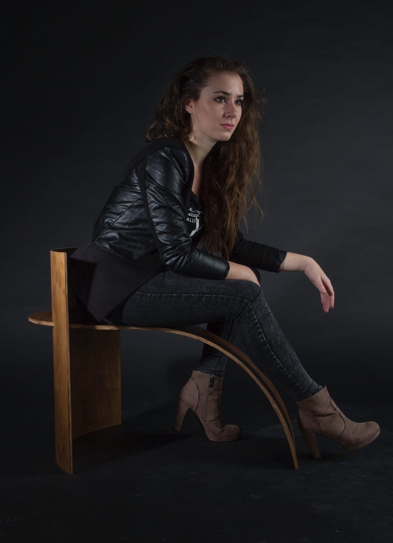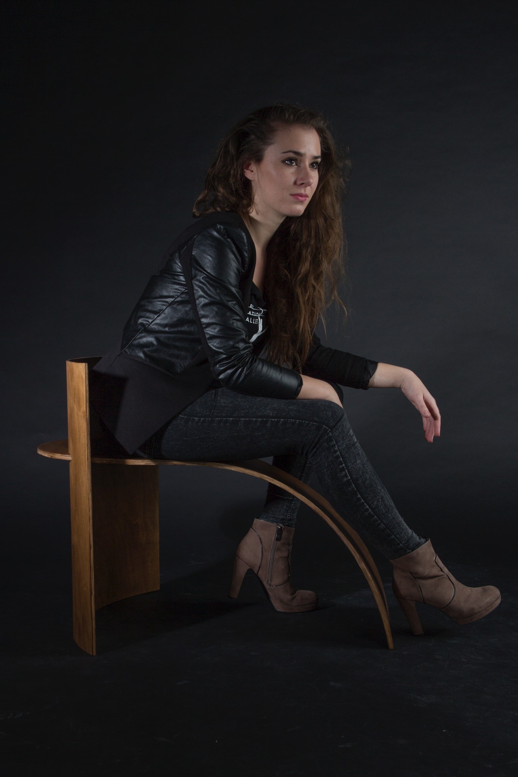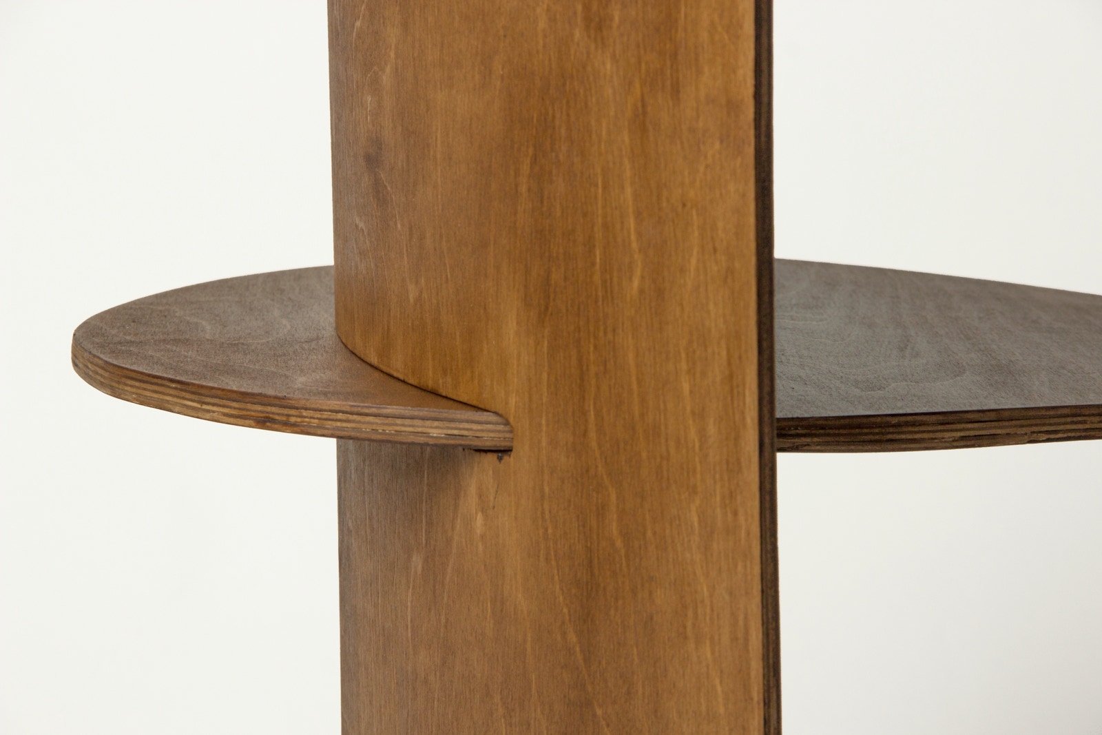Door te experimenteren met de techniek van het buigen van hout door lamineren heb ik een kruk gemaakt. Het uitgangspunt van het ontwerp was een schuivende verbinding. De twee houten delen sluiten op elkaar aan en zijn onbruikbaar zonder elkaar. Er ontstaat een balans tussen de houten delen en in het ontwerp. Het krukje helt een beetje over zodat het recht wordt als je erop gaat zitten. De boog van de houten delen is gelijk zodat het gemakkelijk wordt om de kruk op te bergen of te vervoeren.